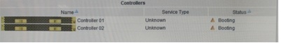 Controllers Faulty-->解决方法 Controllers 01 Faulty 亮黄灯-->解决方法 Controllers 01 Faulty 亮黄灯-->解决方法 Controllers 01 Status:Unknown 亮黄灯-->解决方法 Controllers 02 Status:Unknown 亮黄灯-->解决方法 Controllers: Name Sercie Type Status Controllers 01 Unknown Booting Controllers 02 Unknown Booting CONTROLLER_01: Name: FS1-2 SystemStatus: COLD_STARING Error- The command timed out.(CONTROLLER_CONNECTION_LOST) Command Failed: CONTROLLER_02: Name: FS1-2 SystemStatus: COLD_STARING Error- The command timed out.(CONTROLLER_CONNECTION_LOST) Command Failed: Controllers 01 Status:Normal-->解决方法 Controllers 02 Status:Normal 亮黄灯-->解决方法