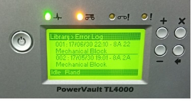错误现象:Library>Error Log->Robotic Failure,错误代码:9E09,上电后,DELL PowerVault TL4000磁带库的机械手失败。 |
